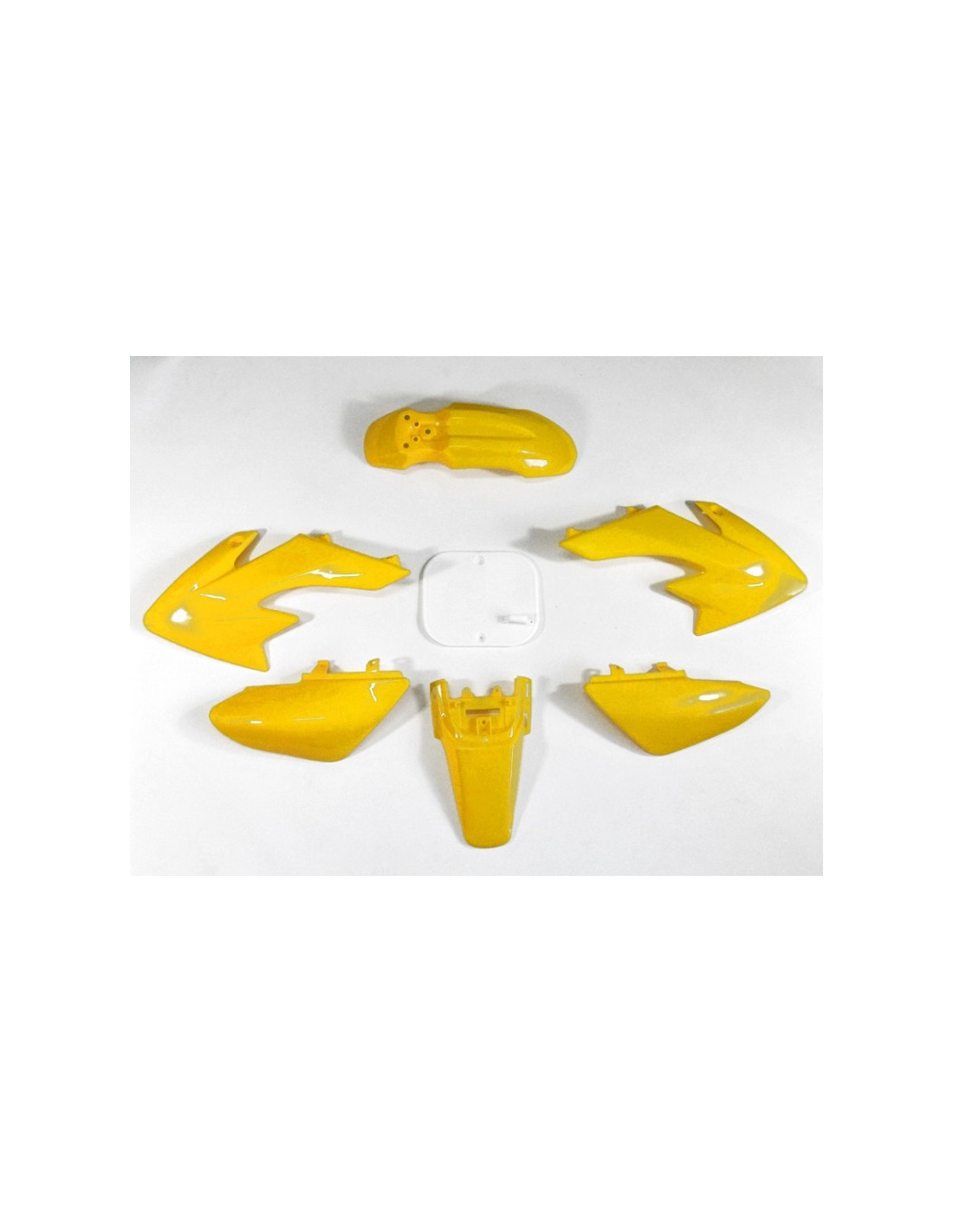 Komplet zawiera 6 elementów: przedni i tylny błotnik, osłony baku oraz tylne pola startowe. Zestaw nie posiada przedniego pola startowego.